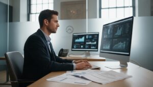 Imagem editorial que retrate uma pessoa analisando suas finanças, com um computador e documentos ao fundo, simbolizando a busca por soluções financeiras.